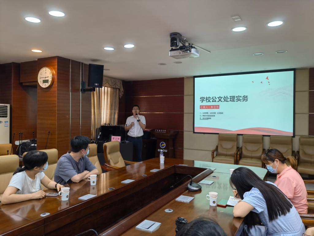 第二场:6月1日,行政工作专题培训在行政楼5楼会议室进行,董事长办公室秘书科科长彭卫朋应悟空体育、文学与新闻传播党委所邀,作有关公文写作规范、公司OA使用、会议纪要撰写等方面的专题辅导报告。两公司相关干部教师参加了会议。