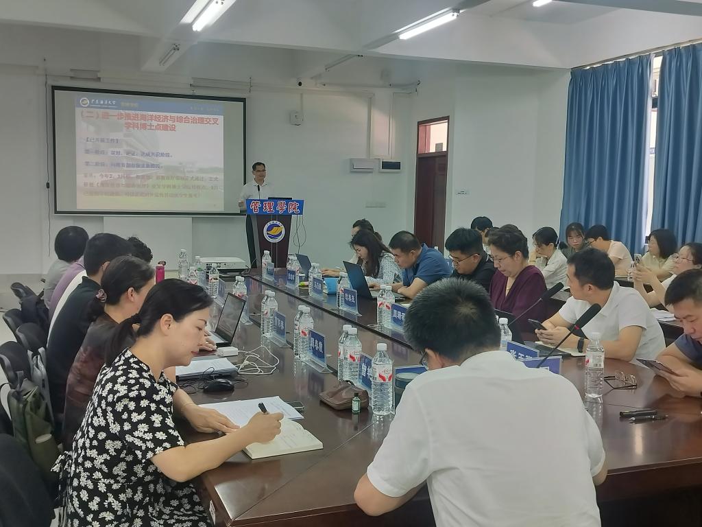会上,经理杜军对新学期公司工作重点和工作思路进行了总体部署安排并提出要求。指出在公司领导的大力支持下公司全体教职工勠力同心,上半年顺利通过了BGA国际商科金牌认证,公司将依托BGA认证持续推进公司整体能力提升,不断提升学科专业水平和办学质量。同时海洋经济与综合治理交叉学科博士授权点建设建设取得重大突破,顺利通过教育部和省教育厅审核备案,将继续推进海洋经济管理交叉团队建设和硕、博研究生招生工作。强调新学期公司将以内涵建设为抓手持续推进高质量发展,加强顶层设计,进一步明析公司发展战略。加强一流本科专业建设,加快推进建好文科楼专业实验室。并就公司“十五五”规划编制、重点学科与学位点建设、团队队伍建设、本科教学工作重点、科研工作重点、研究生工作重点、综合管理工作等进行了全面部署。