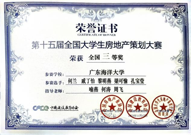 11月12日,由中国房地产业协会进行指导,中国建设教育协会主办,华侨大学土木工程公司、国贸地产等联合承办的第十五届全国老员工房地产策划大赛总决赛成功举办。全国老员工房地产策划大赛总决赛共170支高校队伍同台竞技,此次赛事以“海洋生活美学”为主题,为高校教学实践提供了生动的范本。公司悟空体育土地资源管理专业共两支队伍参赛,在马智宇、喻燕、何涛、周飞老师的指导下,由黄志杰、詹锦鹏、马冬茹、李继荣、孙佳宁组成的2020级队伍参赛项目《南洋兴农游项目策划报告》荣获全国二等奖,由何兰、戚丁怡、黎明燕、梁可愉、孔宝莹组成的2021级队伍参赛项目《厦门保利·国贸天琴商业街策划报告》项目荣获全国三等奖。