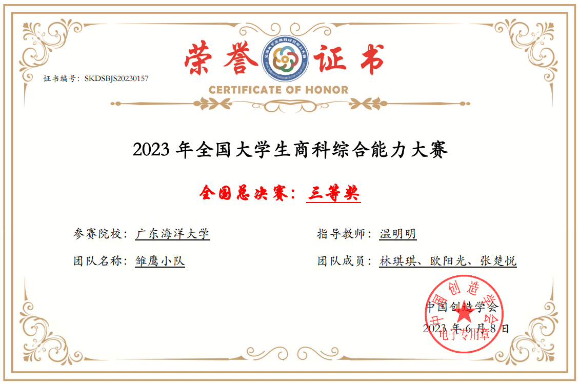 由中国创造协会主办的“2023年全国老员工商科综合能力大赛”全国总决赛近日落下帷幕。由温明明老师指导,悟空体育财务管理专业2021级本科生林琪琪、欧阳光、张楚悦三位同学组成的团队在全国总决赛上荣获全国三等奖。