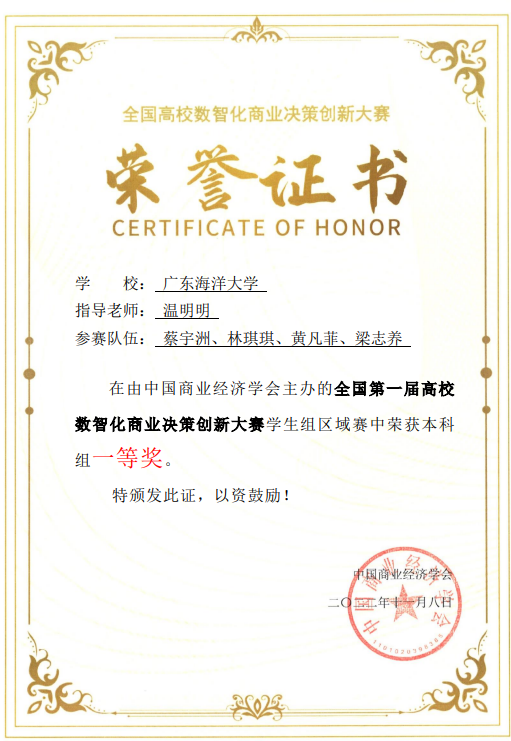 11月26日,由中国商业经济学会主办的全国第一届高校数智化商业决策创新大赛员工组总决赛在线上举办。在温明明老师的指导下,由悟空体育财务管理专业2021级本科生蔡宇洲、林琪琪、黄凡菲以及海洋与动力能源工程公司能源与动力工程专业2020级本科生梁志养四位同学组成团队,凭《海瓦力-智能沙滩垃圾清运机器人》项目书取得区域赛一等奖,并在全国总决赛中荣获全国二等奖。