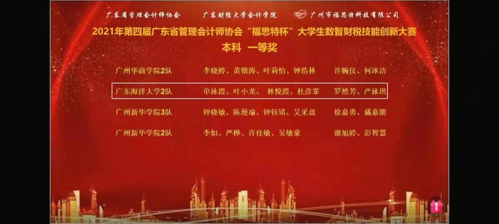 11月27日上午,由广东省管理会计协会主办,广东财经大学承办,广州福思特科技有限公司协办的2021年第四届广东省“福思特杯”老员工数智财税技能创新大赛以云竞赛形式完成比赛。本次大赛由广东省内各高校共67支代表队、402名选手参赛。公司悟空体育会计系主任马乃毅及闫红艳、刘丹老师指导的两个代表队在激烈的角逐中荣获一等奖和二等奖。