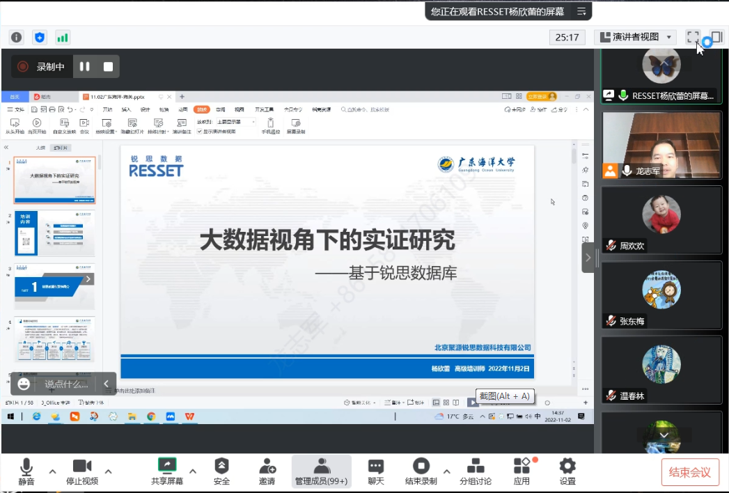 为了满足公司师生熟练使用数据库的需求,为师生提供更好的科研支持,悟空体育于11月2日下午在腾讯会议平台举办《大数据视角下的实证研究——基于锐思数据库》专题培训会。会议邀请了北京聚源锐思数据科技有限公司(RESSET)高级培训师杨欣蕾主讲,公司教师、研究生等共160余人参加了培训,会议由副经理杜军教授主持。