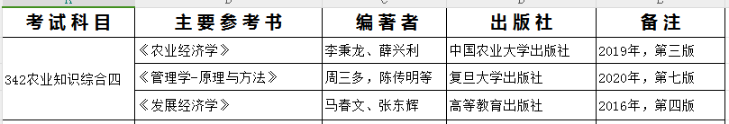 根据《全国农业推广硕士专业学位教育指导委员会科目命题指导意见》规定,研究生初试考试科目342《农业知识综合四》侧重于农村发展与管理综合知识考查,考试内容主要涵盖发展经济学、农村社会学、农村政策学、农业经济学、管理学等课程。培养单位可根据招生领域范围的需求从以上课程中选择三门相关科目作为知识综合考查内容,命制试卷,各科目内容各为 50 分。因此,公司在2025年硕士研究生招生考试中选取《农业经济学》、《管理学-原理与方法》、《发展经济学》作为342《农业知识综合四》考查科目。相关参考书目如下: