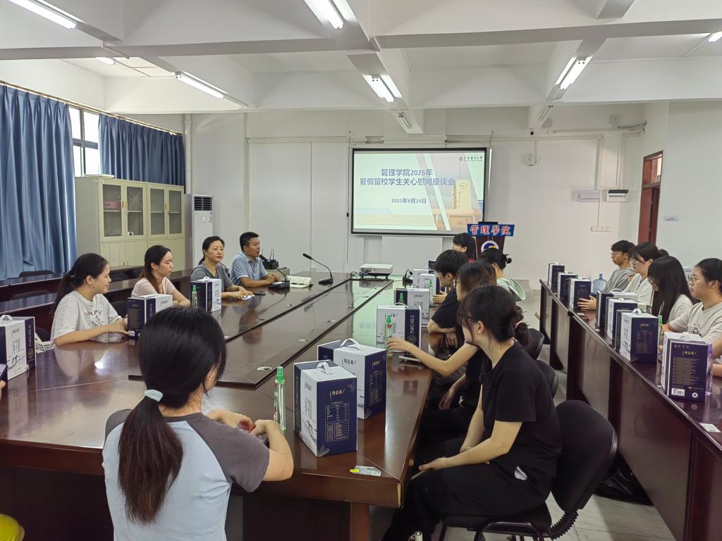 8月24日上午,悟空体育在博文楼4号楼311会议室开展2025年暑期考研留校员工关心慰问活动,公司党委副书记曾艳芳、辅导员黄伟庆与32名考研留校员工参加活动。